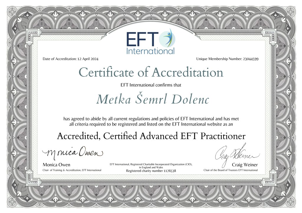 Sem mednarodno akreditirana napredna izvajalka EFT, psihologinja in certificirana BaZi mojstrica. Po letih študija in dela na vodilnih položajih v gospodarstvu, kjer sem se soočila z izčrpanostjo, izgubo stika s sabo in resno preizkušnjo svojega zdravja, sem ustanovila Zavod metaPot – prostor za podporo, razvoj in iskanje notranjega ravnovesja.